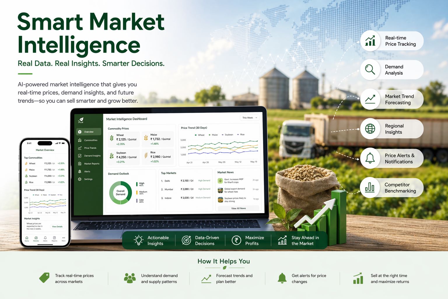 Farmers often sell produce at low prices simply because they lack real-time market data. The Market Feature gives every farmer the same intelligence as large-scale traders — directly on their smartphone, helping maximise profit and eliminate middlemen.